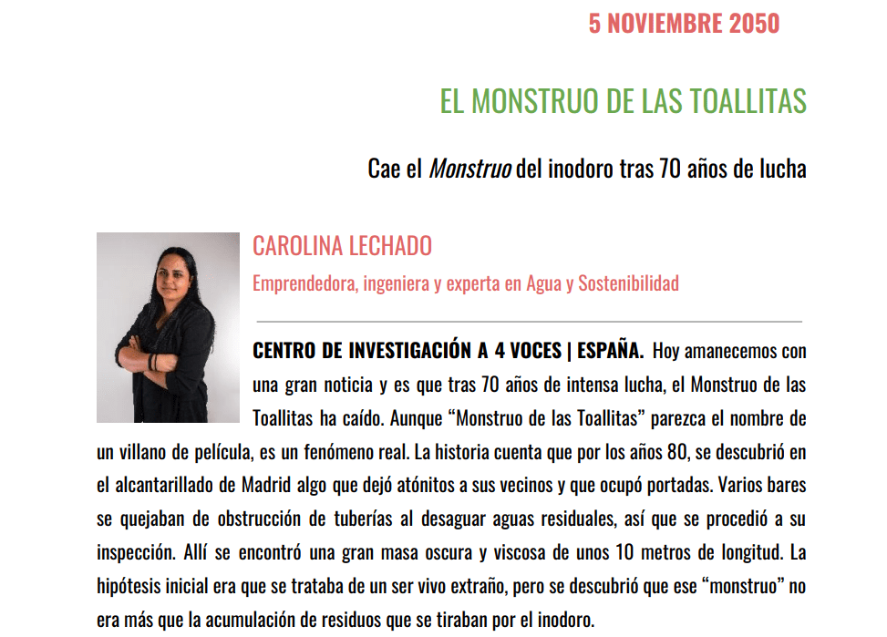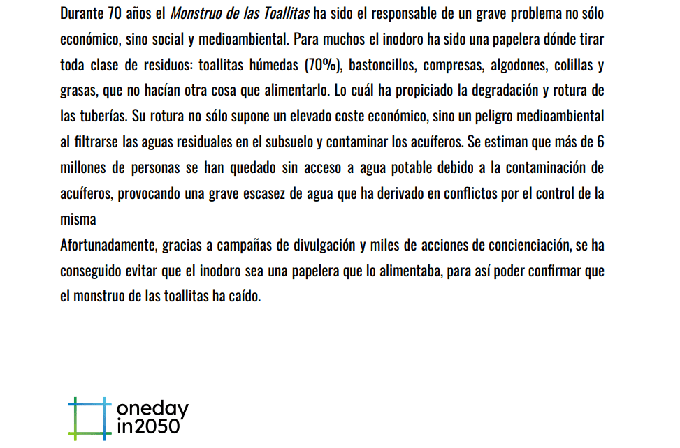 El Monstruo de las Toallitas ha caído Colaboración hecha para oneday2050.org Compártelo: Compartir en X (Se abre en una ventana nueva) X Comparte en Facebook (Se abre en una ventana nueva) Facebook Me gusta Cargando... Relacionado Deja un comentario Cancelar la respuesta Δ